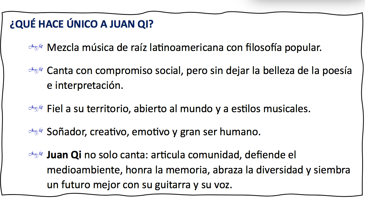 *En la actualidad Juan Qi se encuentra gestionando una nueva gira llamada «Canciones sin tiempo» en donde muestra un compendio de sus mejores canciones. Paralelamente está componiendo las nuevas canciones para el próximo disco: Notas de hogar el lo lleva a una búsqueda sonora aún más propia, intercalando letras que van desde los existencial, lo cotidiano, la niñez, los recuerdos y la esperanza situadad desde los afectos sinceros.